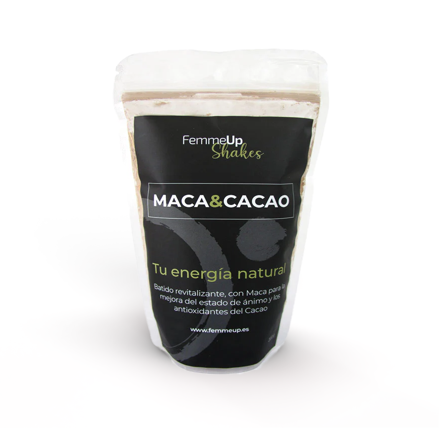 -FemmeUp Shake. C'est le meilleur apport nutritionnel car c'est un aliment complet avec protéines, fibres, fer et zinc, présents naturellement dans la maca, le cacao et la caroube. Il ne contient pas de sucres ajoutés. Tous les ingrédients proviennent de l'agriculture biologique. La maca est un aliment utilisé dans la culture traditionnelle andine pour améliorer la fertilité.