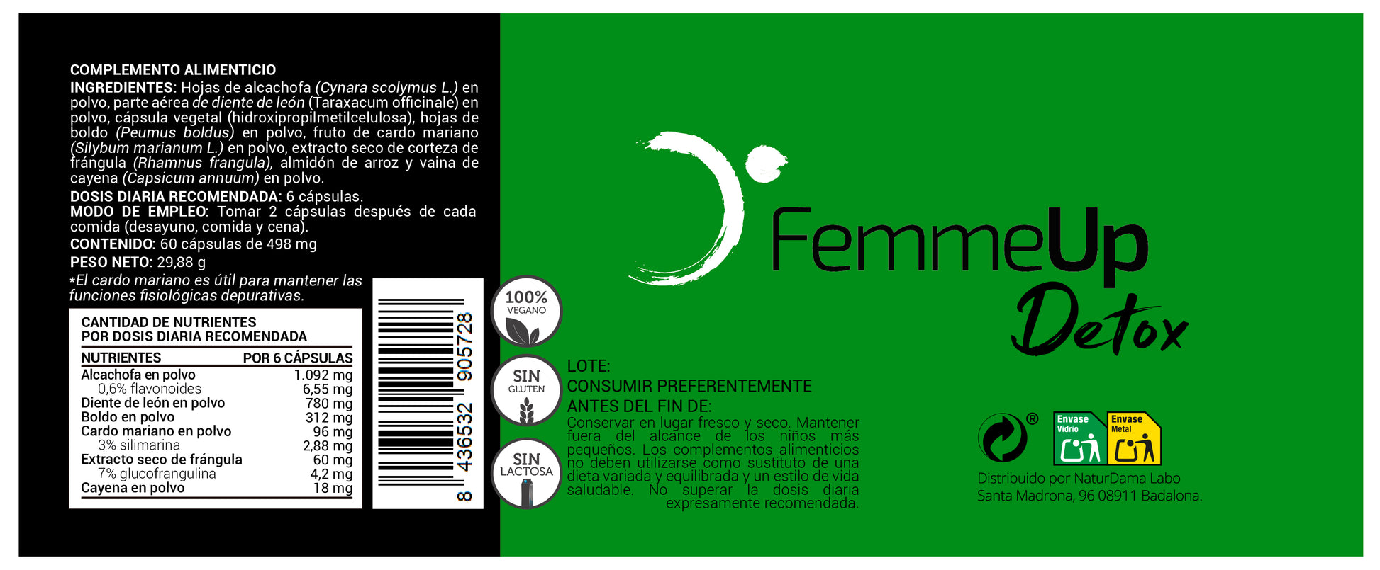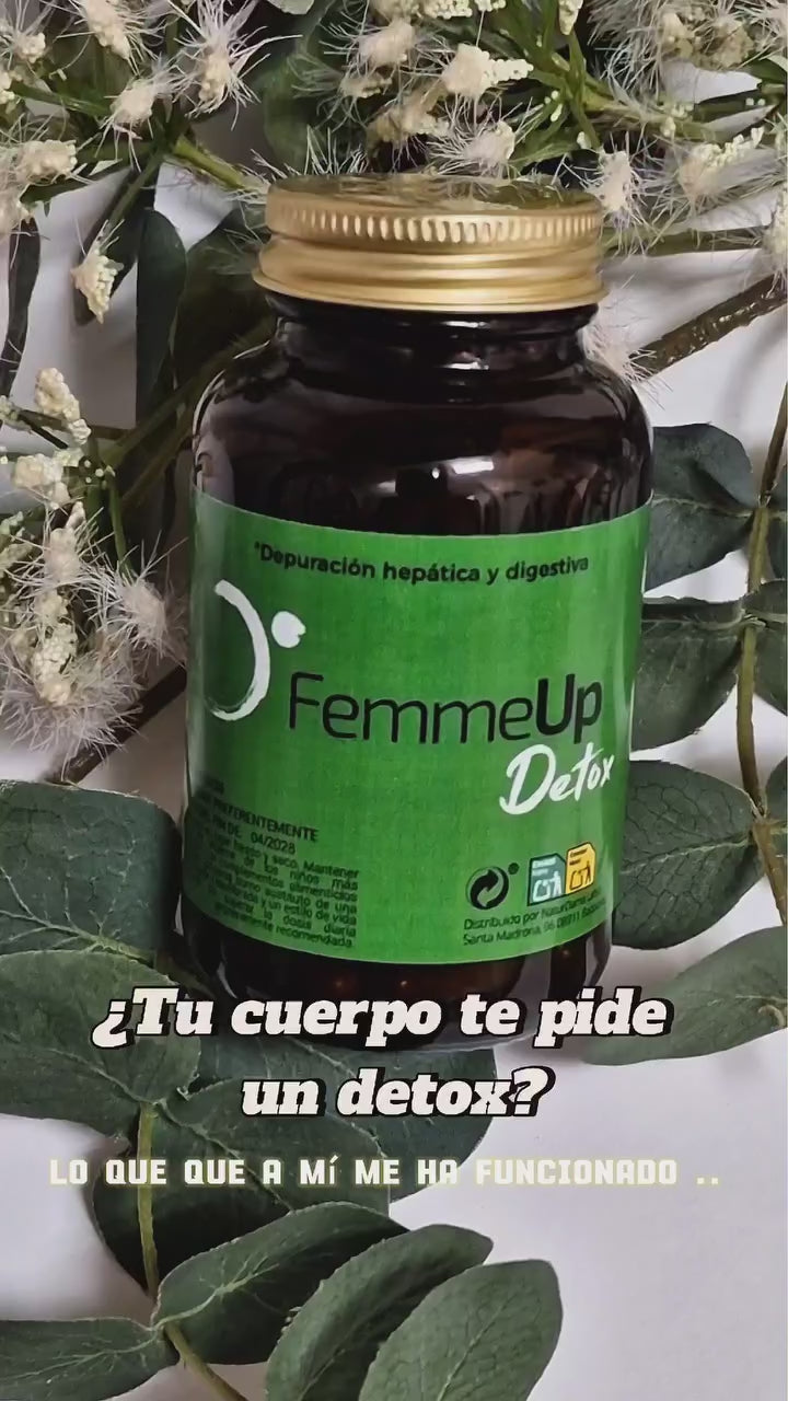 FemmeUp Detox es un complemento alimenticio natural que ayuda a la depuración hepática y digestiva, mejorando el bienestar general.